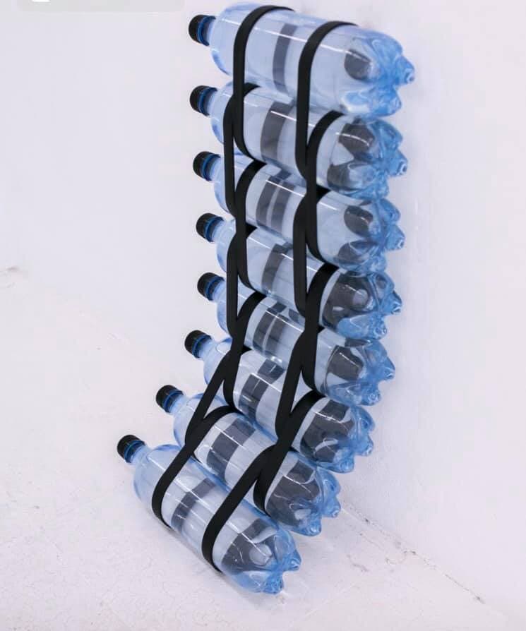 La supuesta obra de arte expuesta se compone, como puede apreciarse, de ocho botellas de plástico llenas de agua. Unidas unas a otras por un elemento que les impide cualquier posibilidad de movimiento, apoyadas en planos y sostenidas en su decadencia.
