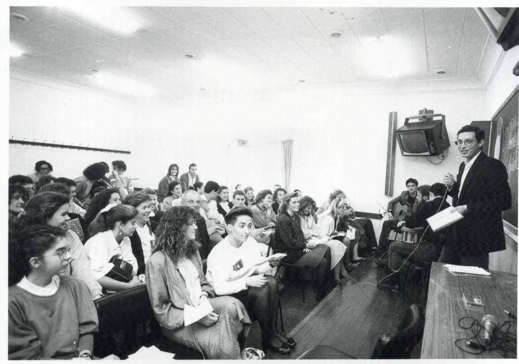 Fotografía: Recital de poesía y guitarra en un aula del edificio Central de la Universidad de Navarra, España, celebrado en 1988, acompañado por Julio Pinel, Ángel Alcalá y César González Cajete. Foto: Manuel Castells.
