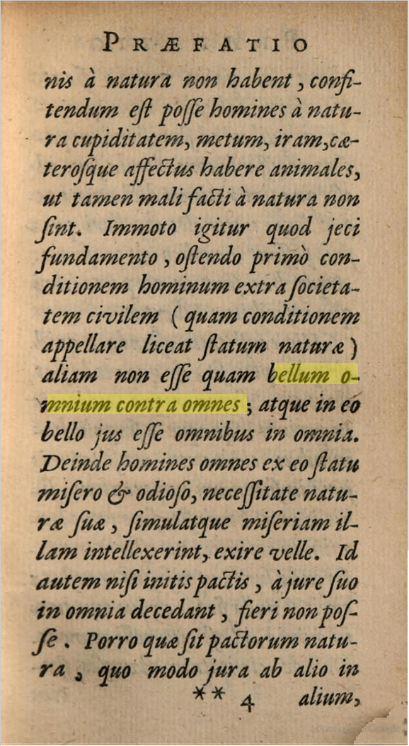 En De Cive (1642) aparece por primera vez en la obra de Hobbes la locución latina Bellum omnium contra omnes (la guerra de todos contra todos) como justificación del contrato social en que los individuos renuncian a libertades por la paz social. (Edición de 1647).