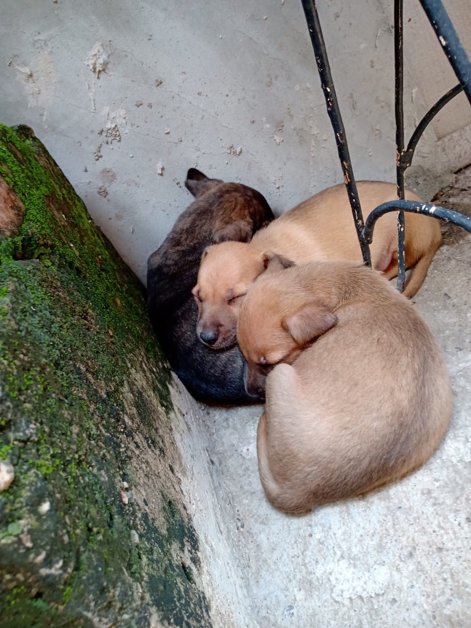 Una vecina fue por ellos y nos los enseñó, eran tres bellos cachorros, dos en color canela y uno oscuro, jaspeado de manchas en tono café claro. Los habían dejado dentro de una caja de cartón, deteriorada por haberse mojado. Los cachorros temblaban de frío, su pelaje estaba húmedo.